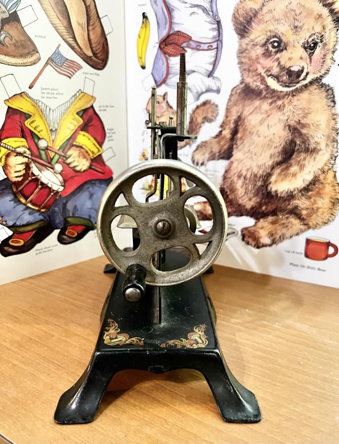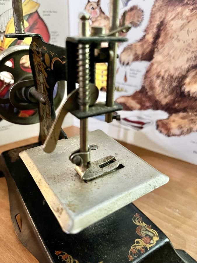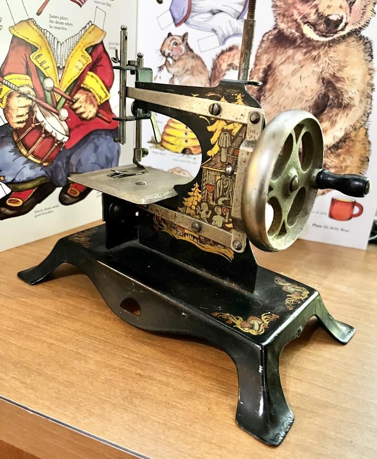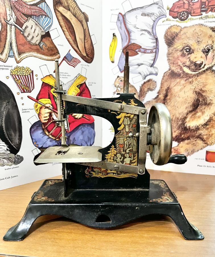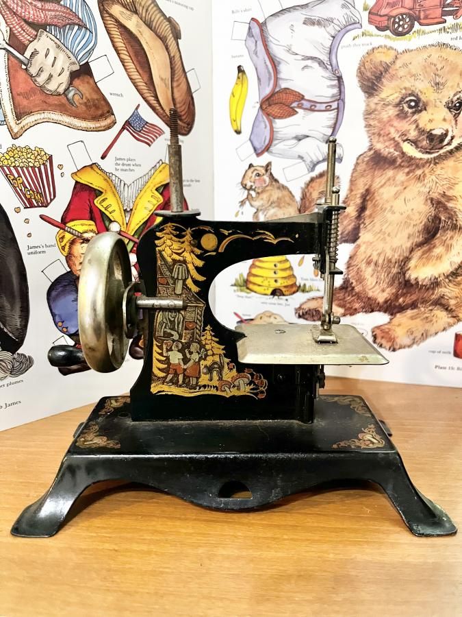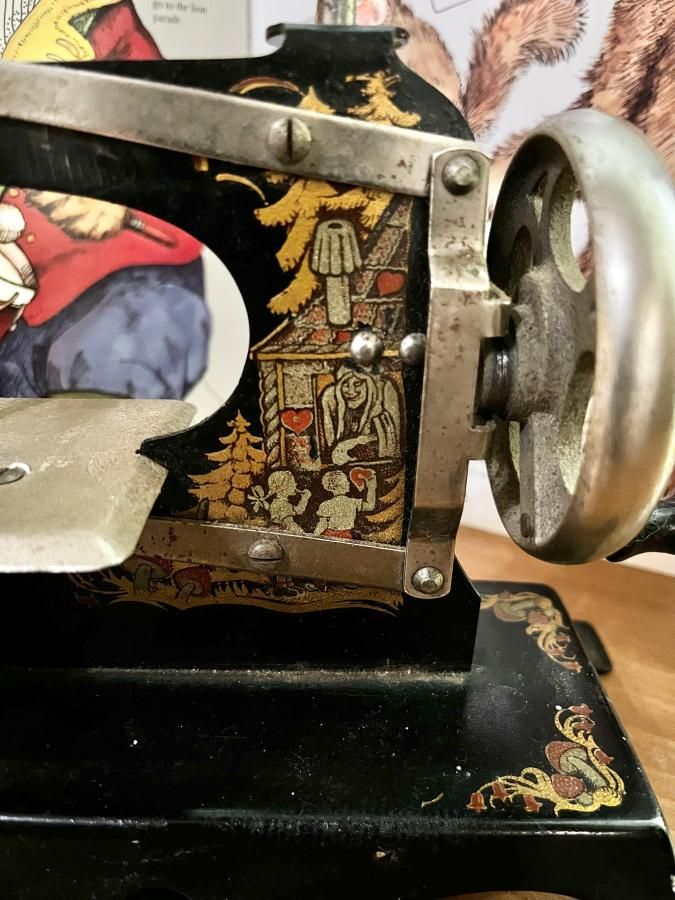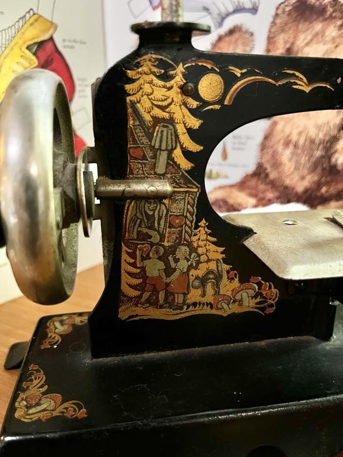 グリム童話のヘンゼルとグレーテルが描かれているトイミシンです。お菓子のお家や赤いきのこなど森の中の様子の可愛いらしい絵です。