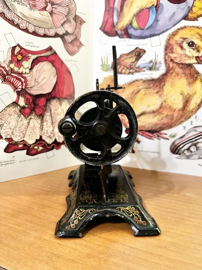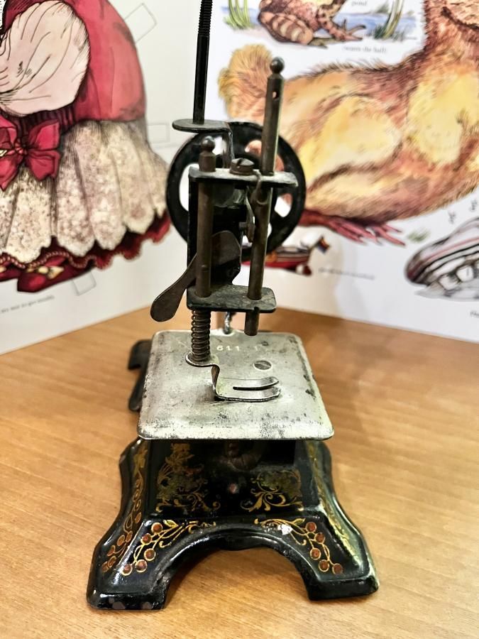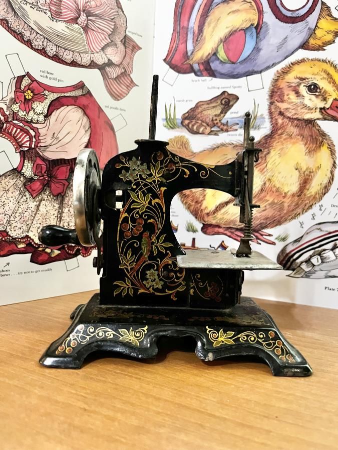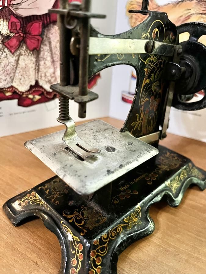 金や緑、朱色などで描かれた自然豊な絵柄が素敵なトイミシンです。
